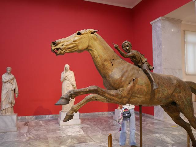 The bronze "Artemision Jockey" (140 B.C.) was recovered from a shipwreck off Euboea Island in the 1920s and '30s and pieced back together in 1971. A museum sign says simply that "an American lady" helped pay for its restoration. Details at 10, I suppose.